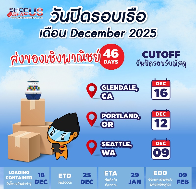 ข่าวประชาสัมพันธ์ เนื่องจากอัตราค่าเงินบาทได้ปรับตัวแข็งค่าขึ้นในปัจจุบัน ทางเราจึงได้มีการปรับเปลี่ยนอัตราค่าขนส่งให้เหมาะสมกับอัตราแลกเปลี่ยนในปัจจุบันให้มากที่สุด ทั้งนี้ สมาชิกที่เลือกชำระค่าขนส่งเป็นเงินบาทไทยจะชำระในอัตราค่าส่งเดิม แต่สมาชิกที่เลือกชำระเป็นเงินอเมริกันดอลล่าห์ จะชำระในอัตราที่ปรับให้ตรงกับอัตราแลกเปลี่ยนจริง นับจากนี้ไป ทางบริษัทจะประกาศให้สมาชิกทุกท่านทราบบนหน้าเว็บนี้ทุกครั้งที่มีการปรับ สำหรับสมาชิกที่ส่งสินค้าไปที่สาขาต่างๆสำหรับใช้บริการทางแอร์เรามีให้เลือก 3 บริการและมีวันปิดรอบสัปดาห์ละ 2 ครั้งมีดังนี้ สาขา Glendale CA Air Premium ปิดรอบทุก วันอังคาร และ ศุกร์ เที่ยงตรง ( ปิด 2 รอบต่อสัปดาห์ ) Air Short และ Air Long ปิดรอบทุกวัน พุธ เที่ยงตรง สาขา Portland OR Air Premium ปิดรอบทุก วันอังคาร และ พฤหัสบดี เที่ยงตรง ( ปิด 2 รอบต่อสัปดาห์ ) Air Short และ Air Long ปิดรอบทุกวัน พฤหัสบดี เที่ยงตรง สาขา Seattle WA ทุกบริการของสาขาจะ ปิดรอบทุก วันอังคาร เวลา 19.00 น. (หนึ่งทุ่ม) รอบเดียวต่อสัปดาห์เท่านั้น!! ถ้าท่านสั่งให้ส่งมาผิดที่อยู่ การเปลี่ยนแปลงจากการส่งทางเรือเป็นเครื่องบิน หรือในทางกลับกัน จะทำให้ใช้เวลาและมีค่าใช้จ่ายเพิ่มขึ้น ทางบริษัททราบดีว่าการเปลี่ยนแปลงนี้เป็นการทำให้สมาชิกต้องตัดสินใจทันทีว่าจะส่งทางเครื่องบินหรือทางเรือ (ซึ่งสมาชิกส่วนใหญ่ไม่มีปัญหา) แต่จะช่วยให้ทางบริษัทจัดการชิปเม้นท์ทั้งทางเครื่องบินและทางเรือ ได้อย่างมีประสิทธิภาพขึ้นมาก Shop and Ship US ทำการขยายเพิ่มจุดรับของในเมืองสำคัญๆ ทั่วประเทศสหรัฐอเมริกา ธุรกิจ บุคคล หรือร้านค้าใดสนใจเปิดบริการเป็นจุดรับของส่งกลับไทย-ลาว-พม่า-กัมพูชา รายได้ดี ผลตอบแทนคุ้มค่า มีการโปรโมทที่เห็นผล มีระบบการทำงานง่าย ชัดเจน ไม่ยุ่งยาก สนใจติดต่อได้ที่ LINE@SSUS บริษัทไม่รับส่งบุหรี่ไฟฟ้าหรือของประเภทบารากู่ เนื่องจากมีการเตือนเยาวชน รวมถึงผู้ใช้บุหรี่ไฟฟ้า ว่าการสูบบุหรี่ไฟฟ้าเป็นอันตรายต่อสุขภาพ และยังมีการกำหนดให้บารากู่และบารากู่ไฟฟ้าและบุหรี่ไฟฟ้าเป็นสินค้าต้องห้าม ซึ่งมีโทษสำหรับผู้ขาย ผู้ให้บริการ โดยจำคุกไม่เกิน 5 ปี ปรับไม่เกิน 500,000 บาท หรือทั้งจำทั้งปรับ และหากผู้ฝ่าฝืนเป็นผู้ผลิต ผู้สั่ง ผู้นำเข้าเพื่อขาย จะมีโทษจำคุกไม่เกิน 10 ปี ปรับไม่เกิน 1 ล้านบาท หรือทั้งจำทั้งปรับ เพื่อเพิ่มความสะดวกและรวดเร็วในข้อมูลข่าวสารการให้บริการกับทุกท่าน สามารถติดตามโปรโมชั่น ส่วนลดพิเศษต่างๆ ข่าวสารในการให้บริการส่งสินค้าได้ตลอดเวลา ส่งตรงถึงท่านฟรีได้ที่ Line@ Offi