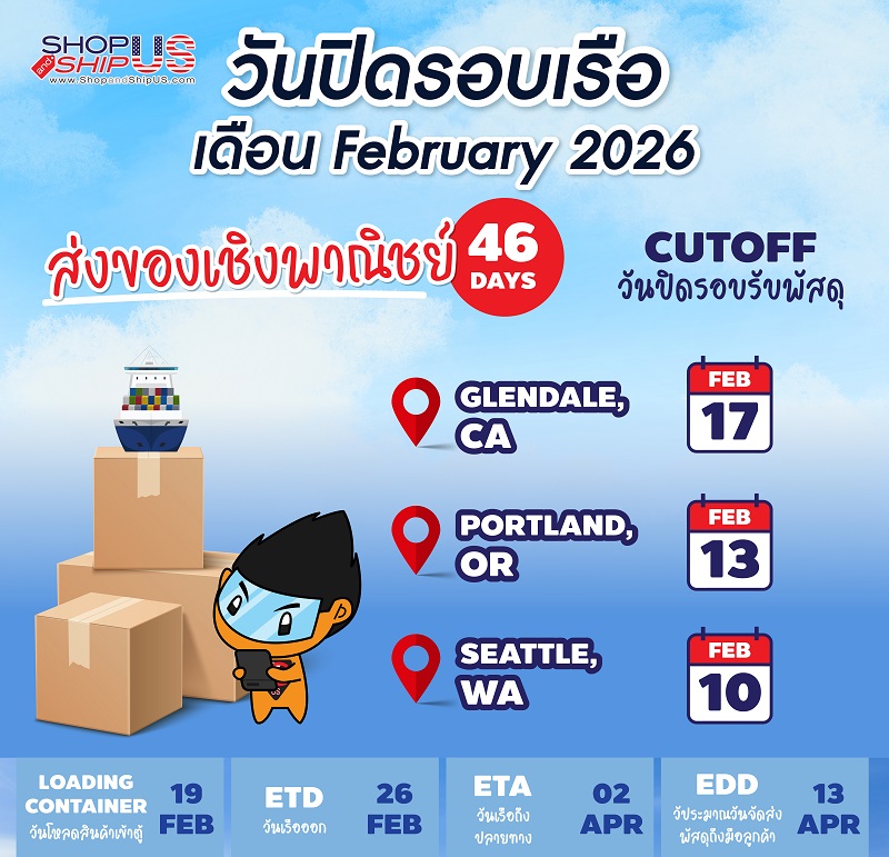 ข่าวประชาสัมพันธ์ เนื่องจากอัตราค่าเงินบาทได้ปรับตัวแข็งค่าขึ้นในปัจจุบัน ทางเราจึงได้มีการปรับเปลี่ยนอัตราค่าขนส่งให้เหมาะสมกับอัตราแลกเปลี่ยนในปัจจุบันให้มากที่สุด ทั้งนี้ สมาชิกที่เลือกชำระค่าขนส่งเป็นเงินบาทไทยจะชำระในอัตราค่าส่งเดิม แต่สมาชิกที่เลือกชำระเป็นเงินอเมริกันดอลล่าห์ จะชำระในอัตราที่ปรับให้ตรงกับอัตราแลกเปลี่ยนจริง นับจากนี้ไป ทางบริษัทจะประกาศให้สมาชิกทุกท่านทราบบนหน้าเว็บนี้ทุกครั้งที่มีการปรับ สำหรับสมาชิกที่ส่งสินค้าไปที่สาขาต่างๆสำหรับใช้บริการทางแอร์เรามีให้เลือก 3 บริการและมีวันปิดรอบสัปดาห์ละ 2 ครั้งมีดังนี้ สาขา Glendale CA Air Premium ปิดรอบทุก วันอังคาร และ ศุกร์ เที่ยงตรง ( ปิด 2 รอบต่อสัปดาห์ ) Air Short และ Air Long ปิดรอบทุกวัน พุธ เที่ยงตรง สาขา Portland OR Air Premium ปิดรอบทุก วันอังคาร และ พฤหัสบดี เที่ยงตรง ( ปิด 2 รอบต่อสัปดาห์ ) Air Short และ Air Long ปิดรอบทุกวัน พฤหัสบดี เที่ยงตรง สาขา Seattle WA ทุกบริการของสาขาจะ ปิดรอบทุก วันอังคาร เวลา 19.00 น. (หนึ่งทุ่ม) รอบเดียวต่อสัปดาห์เท่านั้น!! ถ้าท่านสั่งให้ส่งมาผิดที่อยู่ การเปลี่ยนแปลงจากการส่งทางเรือเป็นเครื่องบิน หรือในทางกลับกัน จะทำให้ใช้เวลาและมีค่าใช้จ่ายเพิ่มขึ้น ทางบริษัททราบดีว่าการเปลี่ยนแปลงนี้เป็นการทำให้สมาชิกต้องตัดสินใจทันทีว่าจะส่งทางเครื่องบินหรือทางเรือ (ซึ่งสมาชิกส่วนใหญ่ไม่มีปัญหา) แต่จะช่วยให้ทางบริษัทจัดการชิปเม้นท์ทั้งทางเครื่องบินและทางเรือ ได้อย่างมีประสิทธิภาพขึ้นมาก Shop and Ship US ทำการขยายเพิ่มจุดรับของในเมืองสำคัญๆ ทั่วประเทศสหรัฐอเมริกา ธุรกิจ บุคคล หรือร้านค้าใดสนใจเปิดบริการเป็นจุดรับของส่งกลับไทย-ลาว-พม่า-กัมพูชา รายได้ดี ผลตอบแทนคุ้มค่า มีการโปรโมทที่เห็นผล มีระบบการทำงานง่าย ชัดเจน ไม่ยุ่งยาก สนใจติดต่อได้ที่ LINE@SSUS บริษัทไม่รับส่งบุหรี่ไฟฟ้าหรือของประเภทบารากู่ เนื่องจากมีการเตือนเยาวชน รวมถึงผู้ใช้บุหรี่ไฟฟ้า ว่าการสูบบุหรี่ไฟฟ้าเป็นอันตรายต่อสุขภาพ และยังมีการกำหนดให้บารากู่และบารากู่ไฟฟ้าและบุหรี่ไฟฟ้าเป็นสินค้าต้องห้าม ซึ่งมีโทษสำหรับผู้ขาย ผู้ให้บริการ โดยจำคุกไม่เกิน 5 ปี ปรับไม่เกิน 500,000 บาท หรือทั้งจำทั้งปรับ และหากผู้ฝ่าฝืนเป็นผู้ผลิต ผู้สั่ง ผู้นำเข้าเพื่อขาย จะมีโทษจำคุกไม่เกิน 10 ปี ปรับไม่เกิน 1 ล้านบาท หรือทั้งจำทั้งปรับ เพื่อเพิ่มความสะดวกและรวดเร็วในข้อมูลข่าวสารการให้บริการกับทุกท่าน สามารถติดตามโปรโมชั่น ส่วนลดพิเศษต่างๆ ข่าวสารในการให้บริการส่งสินค้าได้ตลอดเวลา ส่งตรงถึงท่านฟรีได้ที่ Line@ Offi