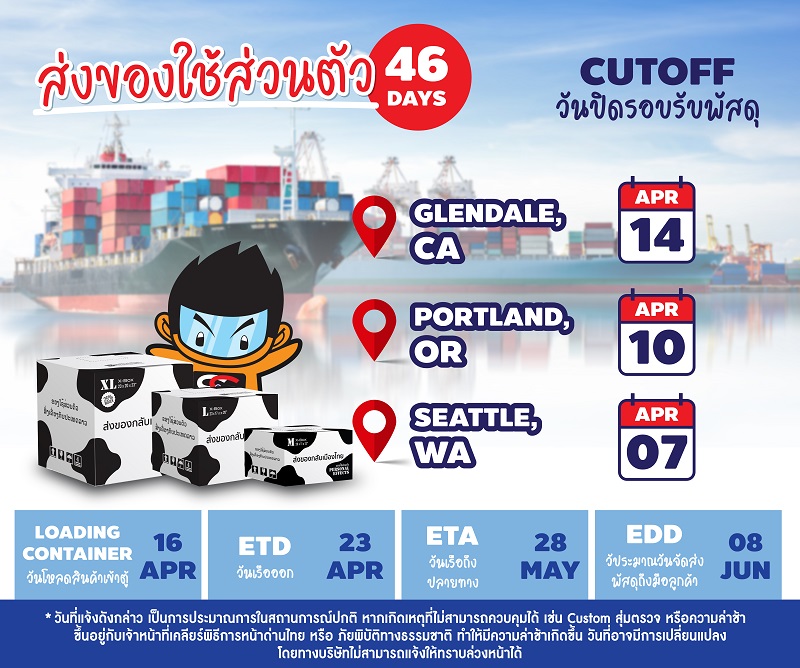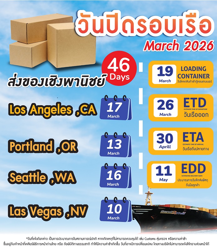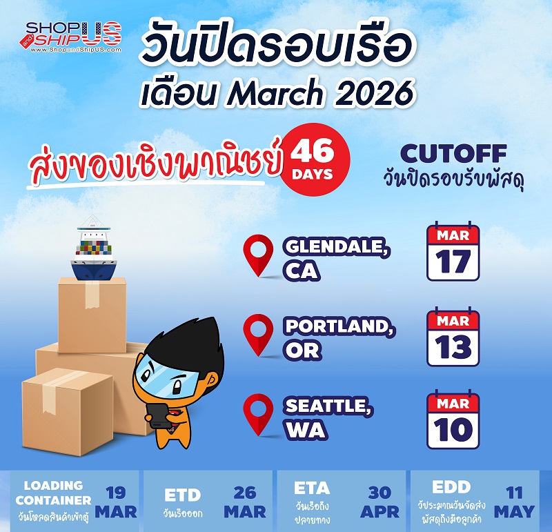 ส่งของทางเรือกลับไทย Shop and Ship US มีบริการส่งสินค้าเชิงพาณิชย์ทางเรือเดินสมุทรไปยังประเทศไทย ให้สมาชิกเลือก 4 ประเภท ได้แก่ Sea Kilo (SK) สำหรับพ่อค้า/แม่ค้าที่ส่งสินค้าที่มีมูลค่าทางภาษี ค่าบริการคำนวณจากน้ำหนัก(ต่อกิโลกรัม) Sea FDA (SF) สำหรับของแบรนด์เนม อาหารและยา หรือ มอก. ค่าบริการคำนวณจากน้ำหนัก(ต่อกิโลกรัม)Sea Cubic FDA (SQF) สำหรับของประเภทอาหารและยา มอก. ค่าบริการคำนวณจากขนาด (ต่อลบ.ฟ.) Sea Cubic Tax (ST) สำหรับสินค้าที่มีน้ำหนักมาก ค่าบริการคำนวณจากขนาด (ต่อลบ.ฟ.+ภาษี) ทั้ง 4 บริการใช้เวลาเดินทาง 45 วันนับจากวันปิดรับในแต่ละรอบ Sea Kilo สินค้าทั่วไป (SK) Service บาท USD กิโลกรัมละ (Minimum 3 kg.) 240 $7.60 Sea FDA สินค้าแบรนด์เนม อาหารและยา (SF) Service บาท USD กิโลกรัมละ (Minimum 3 kg.) 300 $9.50 Sea Cubic FDA สินค้าอาหารและยา น้ำหนักมาก (SQF) Service บาท USD ลบ.ฟ.ละ 1,750 $54 Sea Cubic Tax สินค้าที่มีมูลค่าทางภาษี + ภาษี(ST) Service บาท USD ลบ.ฟ.ละ(+Tax $1.8/kg.) 500 $15.90